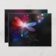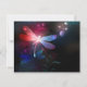 Glowing, flying, red dragonfly, with transparent, detailed wings on dark, nocturnal, luminous background with tropical plants and fireflies. Red dragonfly.