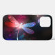 Glowing, flying, red dragonfly, with transparent, detailed wings on dark, nocturnal, luminous background with tropical plants and fireflies. Red dragonfly.