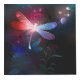 Glowing, flying, red dragonfly, with transparent, detailed wings on dark, nocturnal, luminous background with tropical plants and fireflies. Red dragonfly.