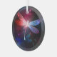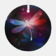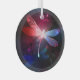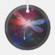 Glowing, flying, red dragonfly, with transparent, detailed wings on dark, nocturnal, luminous background with tropical plants and fireflies. Red dragonfly.