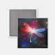 Glowing, flying, red dragonfly, with transparent, detailed wings on dark, nocturnal, luminous background with tropical plants and fireflies. Red dragonfly.