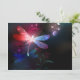 Glowing, flying, red dragonfly, with transparent, detailed wings on dark, nocturnal, luminous background with tropical plants and fireflies. Red dragonfly.