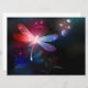 Glowing, flying, red dragonfly, with transparent, detailed wings on dark, nocturnal, luminous background with tropical plants and fireflies. Red dragonfly.