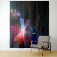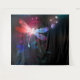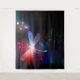 Glowing, flying, red dragonfly, with transparent, detailed wings on dark, nocturnal, luminous background with tropical plants and fireflies. Red dragonfly.