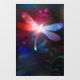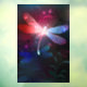 Glowing, flying, red dragonfly, with transparent, detailed wings on dark, nocturnal, luminous background with tropical plants and fireflies. Red dragonfly.