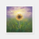 A solitary sunflower stands tall amidst a field of green grass, with a warm glow from the sunlight that seems to radiate through its petals.