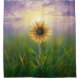 A solitary sunflower stands tall amidst a field of green grass, with a warm glow from the sunlight that seems to radiate through its petals.