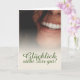 Kompliment Karte mit lachendem Frauengesicht und handschriftlichen Grüßen auf der Vorderseite der Karte. Restliche Flächen stehen zur freien Verfügung.