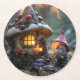 Cute little gnome next to his mushroom house with lights on. Fantasy, whimsical design.