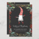 A whimsical watercolor greeting card featuring a cute gnome in a striped red and white hat framed by holly berry branches greenery. Red, white and black.