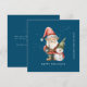 A gnome dressed in red stands beside a snowman in a green elf stocking hat and red scarf. They are surrounded by a dusting of white snow that pops on the dark blue background. The minimalist aesthetic is created with a simple Happy Holidays below and the business name running perpendicular on the right margin. An editable Christmas message is on the back and a place for your business. Easily place your business logo below. A small Christmas tree decorates the top.