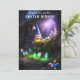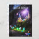 Gnome at Night & Eggs Easter Dinner Invitation. Make this for brunch or breakfast. Gnome holding a basket of Easter eggs at night by his home. Personalise this template with text on the front and back of the card. Edit it to make more changes.