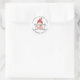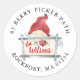A traditional Nisse gnome holds a sign with your name in red script on this round return address label. His flowing red stocking hat and long beard really pop against the white background. Your street address curves above the Christmas gnome and city, state and zip code below. All of the text is editable and easy to personalise. Imagine how cute it will look on your Christmas card envelopes.