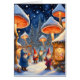 Gnomes in a snowy mushroom-capped woodland scene celebrating with with holiday cheer and community with a small warmly lit vending hut and delicious holiday berries and fruits. Inside reads "Season's Greetings!"