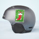 This vinyl sticker has a little gnome wearing a dark red hat in a red Christmas stocking with two candy canes on a green swirl background bordered with snowflakes.