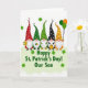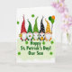 This card features five stylized gnomes lined up on a white background, their round pink noses and fluffy white beards giving them a cozy, friendly look 💚. Each one wears a tall, curling hat that leans and sways like they’re strolling together, creating a gentle sense of closeness and shared fun. The hats bring in lively patterns and colors—red with white polka dots, two different greens with white dots, black with white circles, and a yellow-orange hat with stripes ☘️. Small details add personality: one gnome holds a golden mug, another has a shamrock on a green tunic, and the black-hatted gnome cradles a tiny golden pot like a treasured gift. The last gnome, dressed in warm orange and yellow, holds green and orange balloons that float upward and add height to the scene. Beneath the group, the message “Happy St. Patrick’s Day! Our Son,” appears in green lettering centered near the bottom. The text sits on a soft light-green gradient base, with little green shamrocks scattered around it. The hats curl high above the bearded faces, and the balloons hover to the right in matching green and orange.