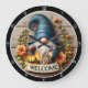 This charming wall decor features a friendly gnome in a blue hat holding a lantern, standing amidst vibrant orange flowers and green foliage. A banner across the bottom reads WELCOME, making it an inviting accent for any home. A delightful item to add warmth and whimsy to your living space.