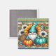A cheerful gnome surrounded by colourful pumpkins, sunflowers, and other flowers, set against a vibrant striped backdrop. The scene exudes a whimsical and festive autumn atmosphere.