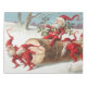 Funny vintage Christmas illustration of little white bearded gnomes dressed like Santa, dragging a cut tree trunk through the snow. Published by L. Prang & Co.
