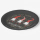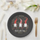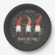 A festive whimsical gnomes Merry Christmas paper plates for your holiday table in red and white on black, with a collection of soft ghosted images of Christmas boughs, pine cones, and pine needles in a round shape. Perfect for serving that Christmas pie or special yearly dessert and other treats with a cheerful festive presentation.