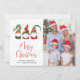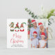 Cheerful holiday card featuring your photo and three cute nordic gnomes with seasonal red and green hats and tunics. "Merry Christmas" is written in a trendy red script. Add your name in simple modern typography.