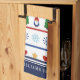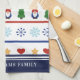 Modern Christmas kitchen towel with a Scandinavian-inspired pattern of Christmas gnomes, spruces, snowflakes, stars, and hearts in a timeless Christmas palette. Add your name or family name!