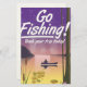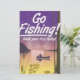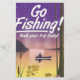 Go Fishing! Funny vintage or retro style travel poster of a fisherman on a lake during the evening sunset.