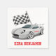 Go-kart or car racing themed Bar Mitzvah paper napkins. This race car Bar Mitzvah paper napkin is stylish and modern. This car racing Bar Mitzvah paper napkin features a grey race car, black and white chequered flag. The colours on this car racing themed Bar Mitzvah design are red, grey, black and white. Your son's name is in a bold font.