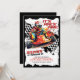 Trendy, modern Go Kart birthday party invitation. Design features typography script ''It's Race Time'' in red lettering , colourful go kart rider illustration, and chequered flag pattern on a white background. Personalise with a name, age and party details in trendy capital lettering. Suitable for any age.