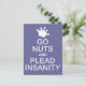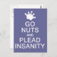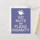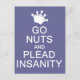 "Go nuts and plead insanity". Using the "customise it" function, you can change (edit) the background colour of this item and add your own text if you wish. See my store for more items with this design.