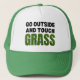 Funny GO OUTSIDE TOUCH GRASS Trucker Hat with bold typography and green grass lettering.