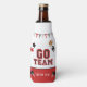 Celebrate football and sports with this festive custom beer and soda bottle cooler. Cooler has red and black stars, a celebratory flag banner, the text Go Team, brown and black footballs, football helmets, and a place for your custom text. This cooler would make a great addition to a football party and it would also be a great gift for a football fan!