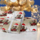 Cute Boer baby goat with her Santa hat and antlers adorned with striped Christmas ornaments, surrounded by a holiday wreath of red poinsettias , pine cones, greenery and a big red bow. A © goatlady GetYerGoat™ original - Best for medium to larger packages, the design is approx 6 inches for each goat -