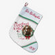 CUSTOMIZE THIS Christmas Stocking Name and Date- Adorable Portrait painting of a Boer goat baby with Christmas greenery, holly and berries, a red bow and mistletoe - with ornate calligraphy text that reads: Christmas Wishes and Baby Goat Kisses - Perfect for the goat lover in the family - won't they be surprised to see this unique Original Christmas goat on their Christmas mantle Christmas morning. A ©goatlady GetYerGoat™ original.