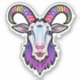 A whimsical goat head sticker with a playful expression, wearing a colourful, patterned hat. The eye-catching design features a pair of curved horns, a bushy beard, and a cheeky grin. The background is a pastel gradient of pink, purple, and blue, creating a vibrant and joyful atmosphere.