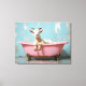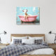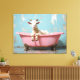 A whimsical painting featuring a white goat with horns relaxing in a vintage pink bathtub, set against a light blue wall for a charming and playful rustic scene.