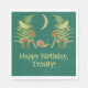 My illustrations depict a natural world with some dark undertones. A crescent moon hangs in the sky above a scene of green ferns, yellow moths, brown mushrooms and a green and brown snail all set against a dark teal coloured background. These paper napkins are ready to be personalised with your own message in pale yellow lettering.