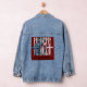 Celebrate your faith and patriotism with this stylish denim jacket featuring God Bless America and Land That I Love text. Adorned with crosses and a subtle American flag design, this jacket is perfect for showing pride wherever you go. Comfortable, durable, and versatile, it’s ideal for layering in any season.