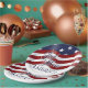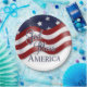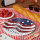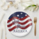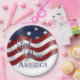 The God Bless AMERICA design has navy blue background with white stars at the top and red and white stripes in the middle. The flag is shaded to look like a waving flag. God Bless is on top of the flag in a hand painted look with white on bottom and navy blue on the top. AMERICA is in all navy blue. Great paper plates to use at your next 4th of July or patriotic party.