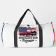 This white duffle bag features a patriotic design with an American flag, silhouettes of saluting soldiers, fighter jets, and a naval ship, with the text "GOD BLESS OUR Veterans." This design is perfect for showing respect and gratitude for military veterans. Edit colour of the bag caps and body in the Design tool to your favored colours.