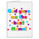 Big, bright colourful text with lots of hearts reads "God gave me the best Mama!" on best Mama T-shirts, stickers, tote bags, cards, bodysuits, and more!