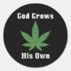 This "God Grows His Own" funny sticker features a large green weed leaf on a black background with white text that says, "God Grows His Own." And He does.