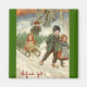Vintage image for a Scandinavian greeting. Little boys and girls walking through the snow with their Christmas tree and pulling their little sister on a sled. Tiny image on limited gift products.