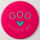 Stylishly accessorise with the God Loves Me Dark Pink Button designed by Powerful Positive You, LLC.