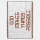 This throw blanket showcases the words “God Makes Things Possible” in a unique space age print font with black letters orange outline in this dual colour faith based style and theme. This Blanket is made with from 75% cotton and 25% polyester with a very soft feel hand washing recommend.