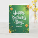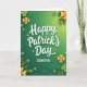 This greeting card features “Happy Patrick’s Day” centered near the top in white lettering with a thin emerald outline, with “GODMOTHER” placed directly below in neat, uppercase white text. Behind the words, a green gradient glows from bright lime in the middle to deeper moss tones around the edges, like a soft spotlight on the message. Shamrocks and four-leaf clovers scatter across the scene, curving inward to frame the text and guide your eye. Some clovers are classic green, while others shift to golden-orange and sunny yellow, adding a warm contrast that feels like a friendly wink between loved ones 💚. The clovers have a slight layered look, giving them gentle depth against the smooth background. Fine line accents and small foliage shapes peek out from the darker edges, adding texture without crowding the center. A cluster of orange-yellow clovers sits off to one side, glowing against the deep green border with a small ☘️ nearby.