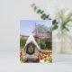 Another cute photo in the anthropomorphic postcard series: The Adventures of Ally, The Australian Kelpie dog. Here she is visiting the gardens in The Netherlands, dressed as a Dutch girl with pigtail braids and a Dutch hat. A windmill and a bed of colourful tulips can be see in the background. Photographer: Louise Docker
