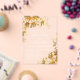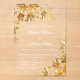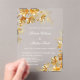 This elegant luxury wedding invitation features 3 dimensional gold flowers and golden line art flowers on a transparent background. Bride and groom names in an elegant classic script.