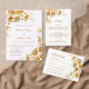 This elegant luxury wedding invitation features 3 dimensional gold flowers and golden line art flowers on a white background. Bride and groom names in an elegant classic script.