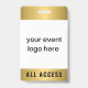 Customise this faux metallic gold all access event pass badge with your logo. If your logo is square, it will fill up the white space entirely. If your logo is not square, it will show on a gold background. The back of the simple, modern design badge can be personalised with the event name and date or year, or you can delete both to have an all gold colour back. This minimalist all access pass badge is ideal for various types of passes at special events, festivals, concerts and conventions. You can easily personalise the name of the pass if you like also.